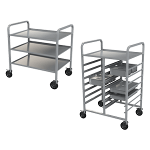 Предназначены для сбора и транспортировки грязной посуды. Рамы изготовлены из нержавеющей трубы AISI 304 сечением 25x25 мм. К рамам приварены 2 полки грузоподъёмностью 50 кг каждая. По периметру полок располагается герметичный бортик высотой 100 мм. Тележка оборудована 4 колесами, одно из которых оснащено тормозом.