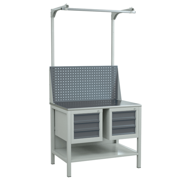 - Оснащается оцинкованной столешницей, одинарным либо двойным перфорированным экраном с консолями и двумя подвесными тумбами с тремя выдвижными ящиками каждая.