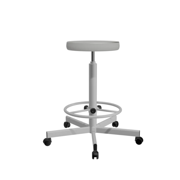 - Табурет на винтовой опоре Т02-1/К (на колесах), обивка светло-серая, каркас белый — это удобное и стильное решение для дома, офиса и других рабочих пространств. Идеален для тех, кто ищет комфорт и мобильность в одном предмете мебели.