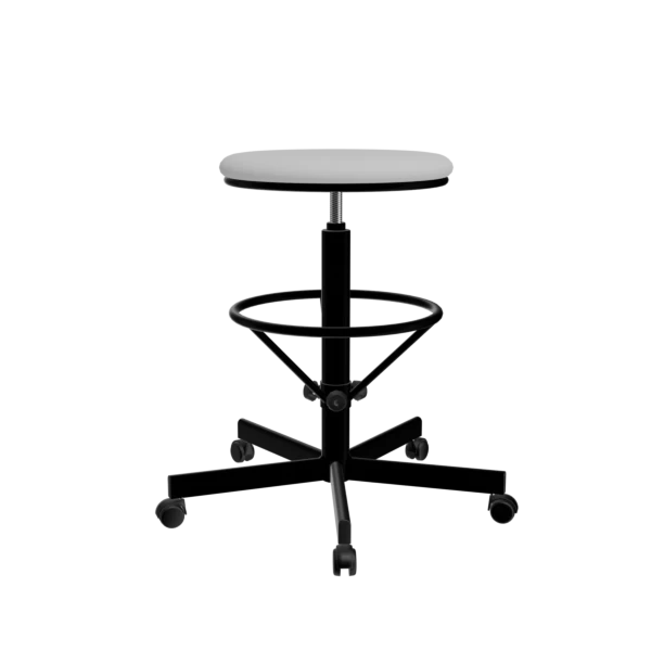 - Табурет на винтовой опоре с усиленной опорой для ног Т03/К (на колесах), обивка белая, каркас черный — универсальное решение для медицинских учреждений, косметологических кабинетов, лабораторий и офисов.