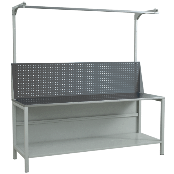 - Оснащён оцинкованной столешницей, комплектуется одинарным либо двойным экраном с консолями для размещения навесных инструментов.