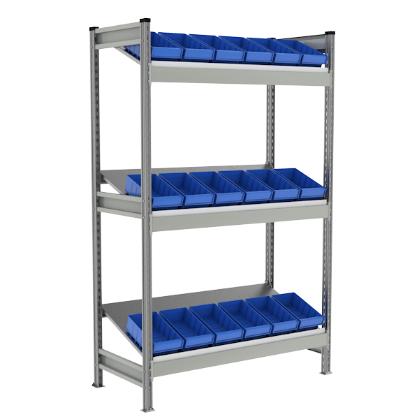 - Предназначен для хранения различных мелких грузов в пластиковых ящиках, установленных на наклонные ярусы хранения.