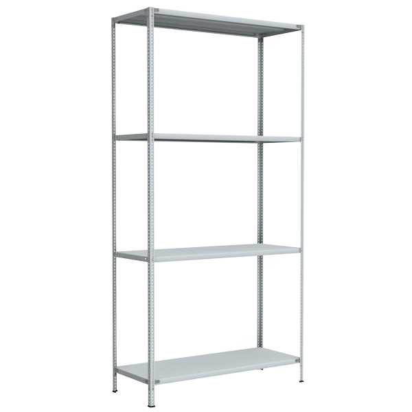 - Состоит из перфорированных стоек, сплошных горизонтальных полок, а также пластиковых подпятников, обеспечивающих сохранность напольных покрытий.