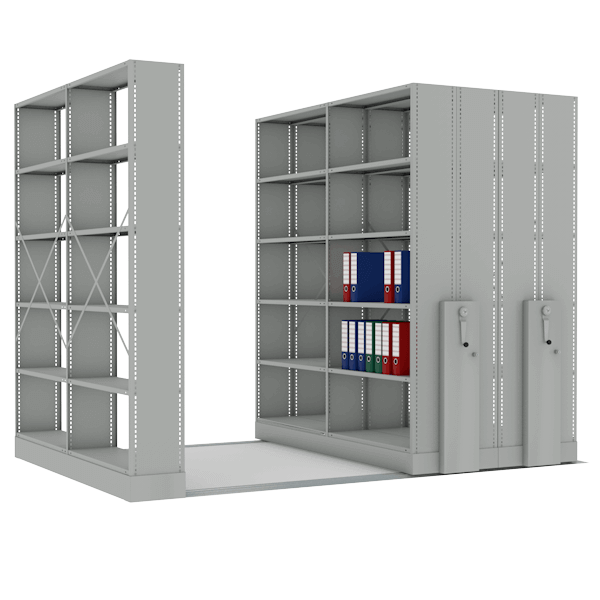 - Конструкция: стационарный стеллаж у стены, остальные секции перемещаются по рельсам.