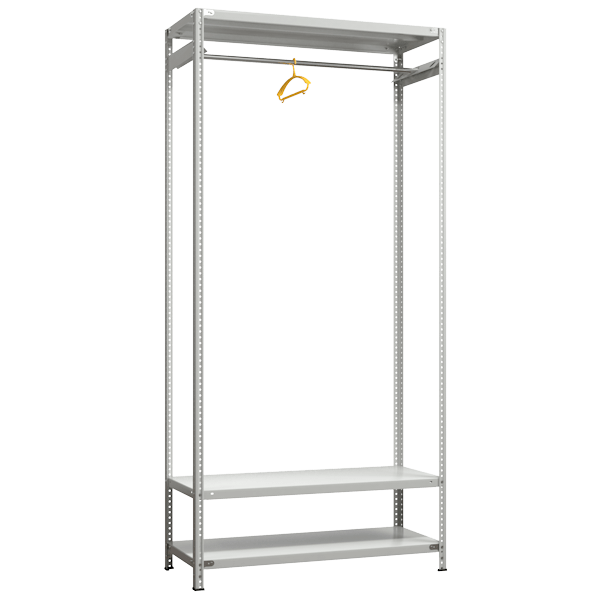 - Представляет собой один ярус-вешало с тремя полками и одной штангой.
