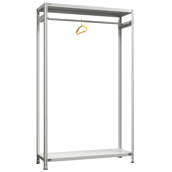 - Состоит из 4 стоек, 2 полок и яруса-вешала со штангой для размещения одежды на плечиках.