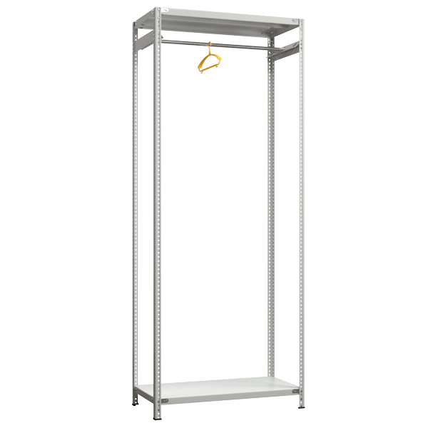 - Состоит из 4 стоек с перфорацией, 2 полок и одного яруса-вешала со штангой для одежды на плечиках.