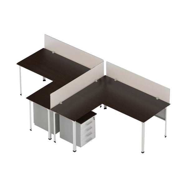 - Рабочее место формируется из двух офисных столов, двух столов-приставок, двух экранов и трех перегородок.