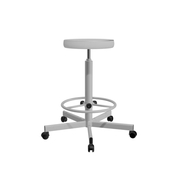 - Под сиденьем имеет регулируемую по высоте кольцо-опору для ног на колёсных опорах.