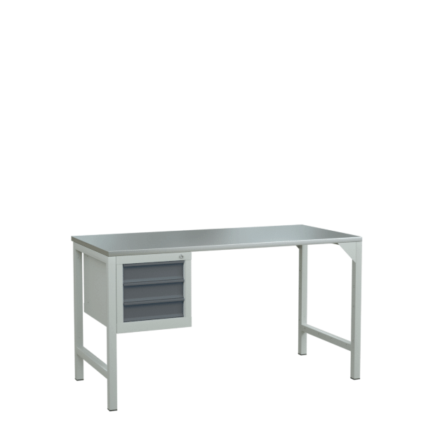 - Оснащён оцинкованной столешницей и одной инструментальной тумбой с тремя выдвижными ящиками.