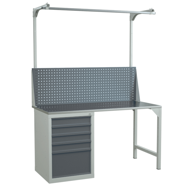 - Корпусы верстака, тумб, консоли и перекладина выкрашены в серый (RAL 5012), цвет ящиков и экрана – серый (RAL 7016).