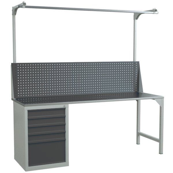 Верстак 2000 с экраном с консолями и тумбой с 5 выдвижными ящиками