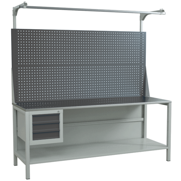 - Слесарный верстак-тумба оснащён оцинкованной столешницей, подвесной тумбой с тремя выдвижными ящиками и двойным перфорированным экраном.