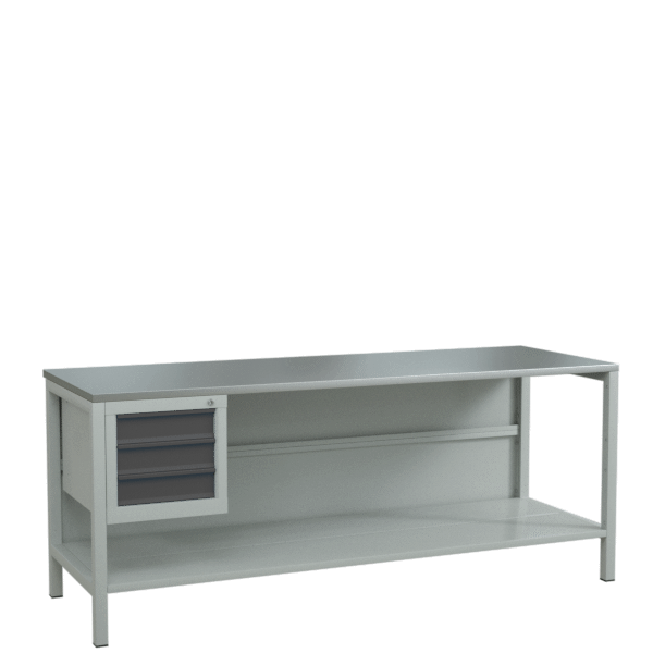 - Оснащён оцинкованной столешницей и подвесной тумбой с тремя выдвижными ящиками.