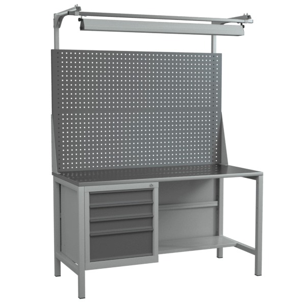 Верстак 1500 с двойным экраном, светильником, полкой и тумбой с 4 ящиками