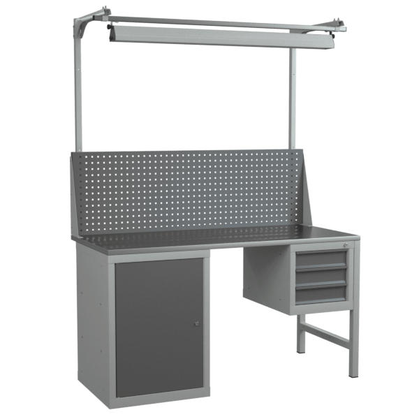 Верстак 1500 с 2 тумбами, экраном с консолями и светодиодным светильником