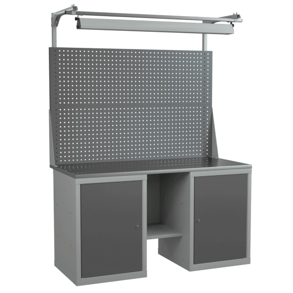 - Комплектуется оцинкованной столешницей, двумя тумбами, одинарным либо двойным перфорированным экраном с консолями и светодиодным светильником.