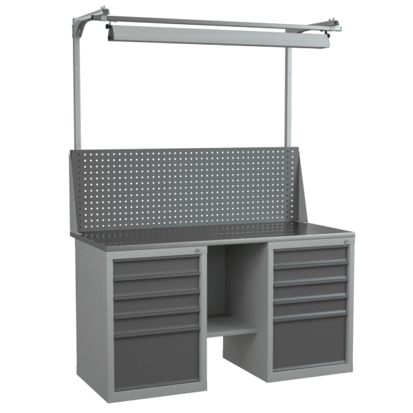 - Предназначен для оснащения мастерских и производственных участков: металлический верстак шириной 1500 мм с двумя тумбами, светодиодным светильником, экраном на консолях и полкой-стенкой.
