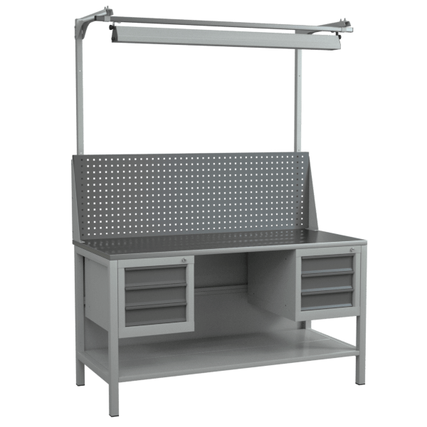 - Оснащён двумя подвесными тумбами с инструментальными ящиками, перфорированным экраном и светодиодным светильником.