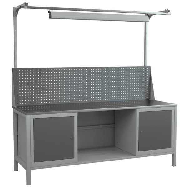 Верстак 2000 со светильником, полкой, экраном и 2 тумбами с распашными дверцами и 2 полками