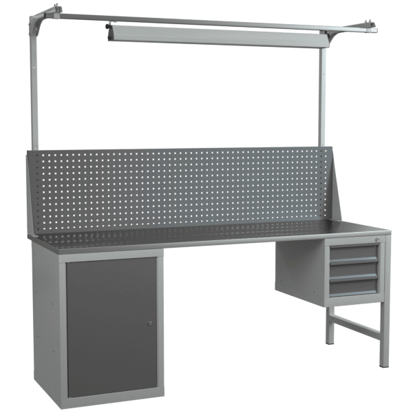 Верстак 2000 со светильником, экраном с консолями, подвесной тумбой с 3 ящиками и тумбой с дверцей и 2 полками
