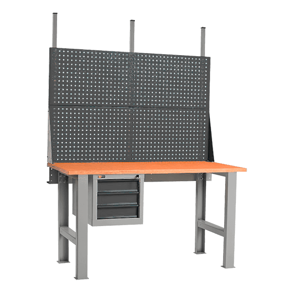 - На верстак устанавливается перфорированный экран и подвесная тумба с тремя выдвижными ящиками.