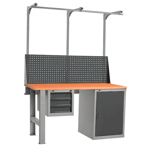 - На верстак устанавливается перфорированный экран, консоль и подвесная тумба с тремя выдвижными ящиками.