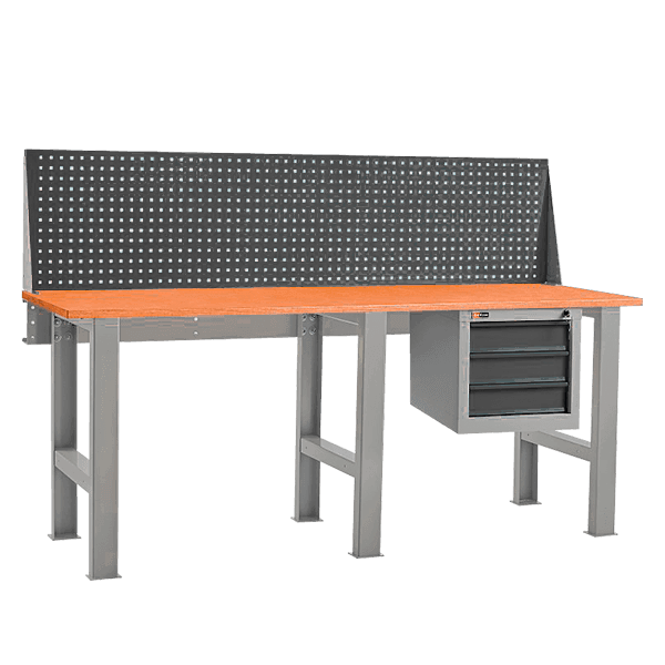 - На верстак устанавливается перфорированный экран и подвесная тумба с тремя выдвижными ящиками.