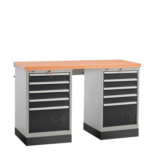 - Опоры столешницы – две напольные тумбы с 5 выдвижными ящиками, которые запираются на центральный замок. Ящики выдерживают нагрузку до 100 кг.